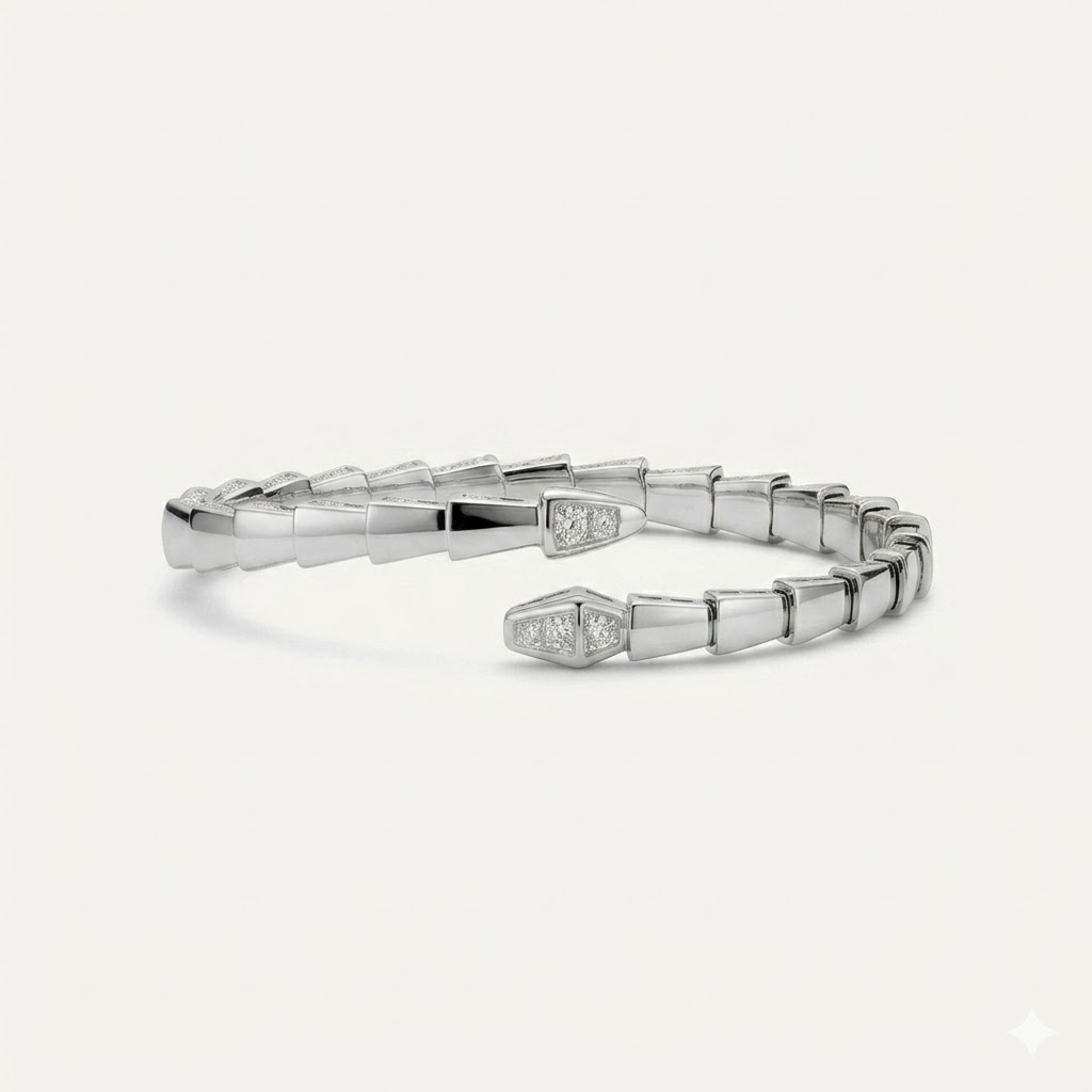 צמיד במבנה הנחש האייקוני והמוכר, עשוי כסף טהור 925 בעיצוב קשקשים גיאומטרי. הדגם משובץ באבני זירקוניה 5A מנצנצות רק בראש ובזנב הנחש, למראה נקי עם טאץ' יוקרתי וממוקד.