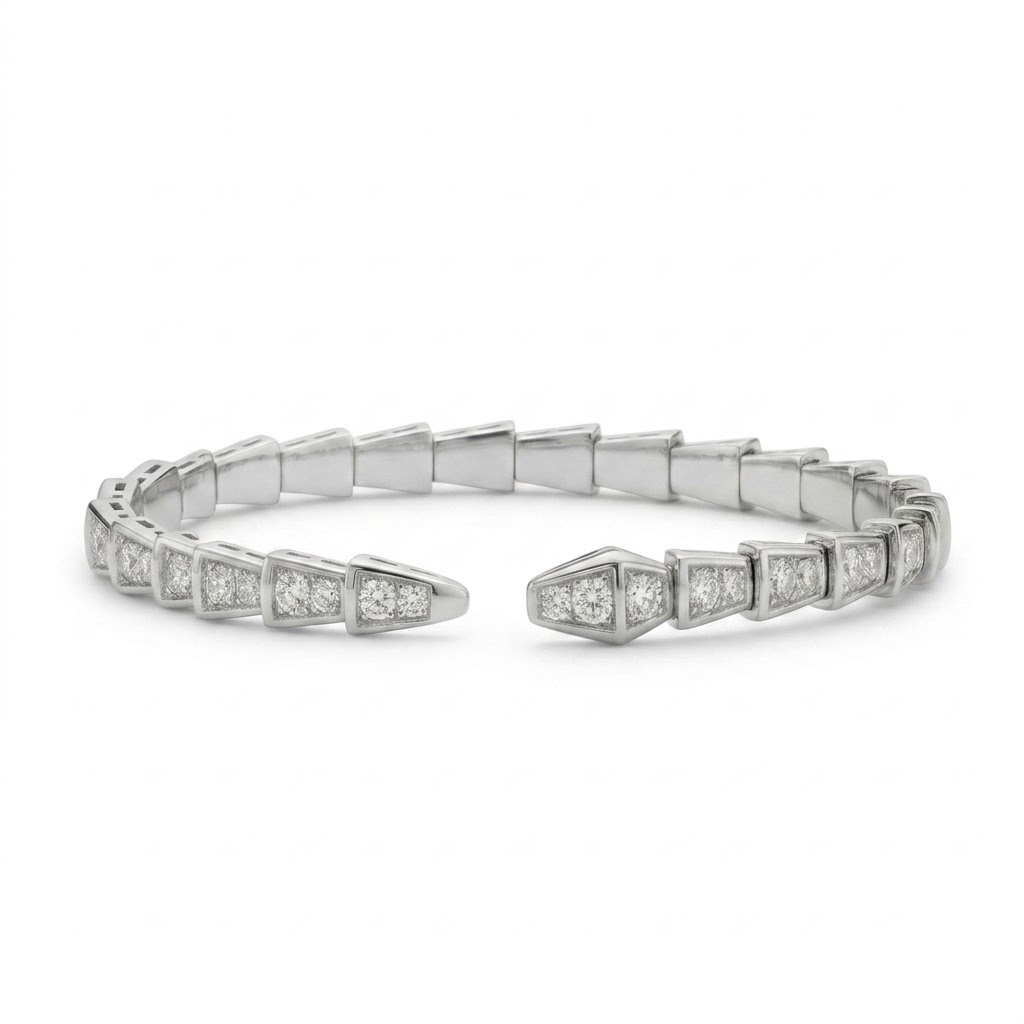 צמיד במבנה המוכר והאייקוני, עשוי כסף טהור 925 בעיצוב קשקשים גיאומטרי. כל חוליה משובצת באבני זירקוניה 5A למקסימום החזר אור ונצנוץ יוקרתי.