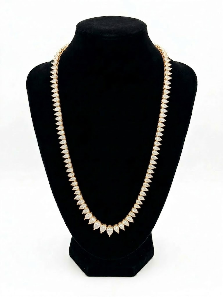 שרשרת טניס יוקרתית בשיבוץ אבני טיפה (Pear Cut) במבנה מדורג, עשויה כסף טהור 925 ומשובצת אבני זירקוניה 5A. הדרגה הגבוהה ביותר של אבני זירקוניה – לרמת נצנוץ מקסימלית ומראה נקי ויוקרתי.